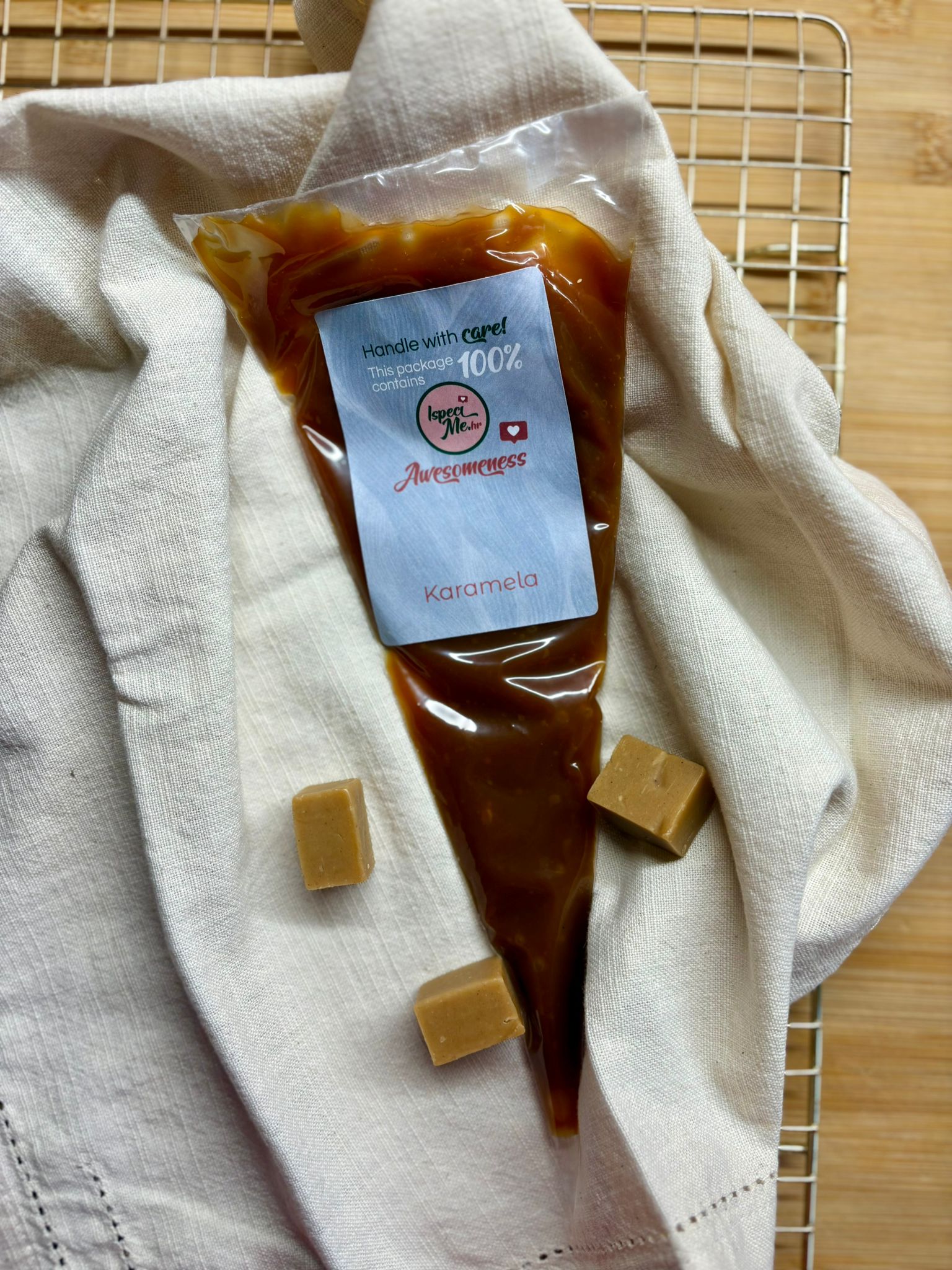 Domaća karamela – kremasta, bogata i svestrana. U Ispeci me poklon paketima često dolazi uz Brownie Pecan/Caramel ili Apple Caramel/Walnut, a jednako dobro se slaže s tortama, kolačima, sladoledima i kavom. Jedna žlica karamele pretvara običan desert u pravi užitak.