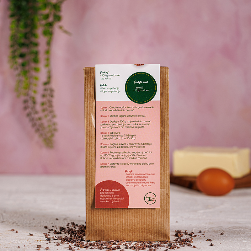U svakoj vrećici nalazi se pažljivo izbalansirana mješavina za zobene kekse s čokoladom, s komadićima kvalitetne tamne čokolade koji se tijekom pečenja lagano tope i stvaraju onaj pravi “bakery style” cookie.